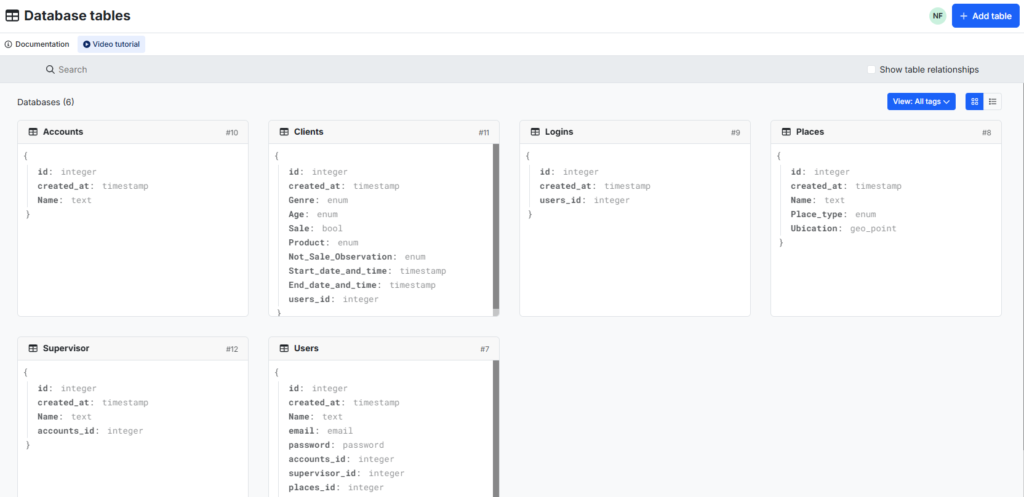 Estructura BBDD en Xano vinculada a Adalo