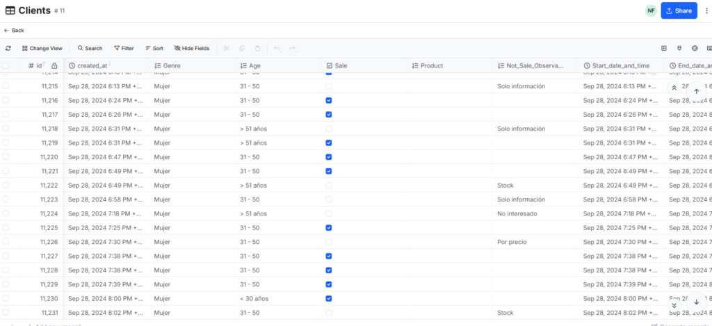 Ejemplo tabla Clientes registrados por promotores en Xano