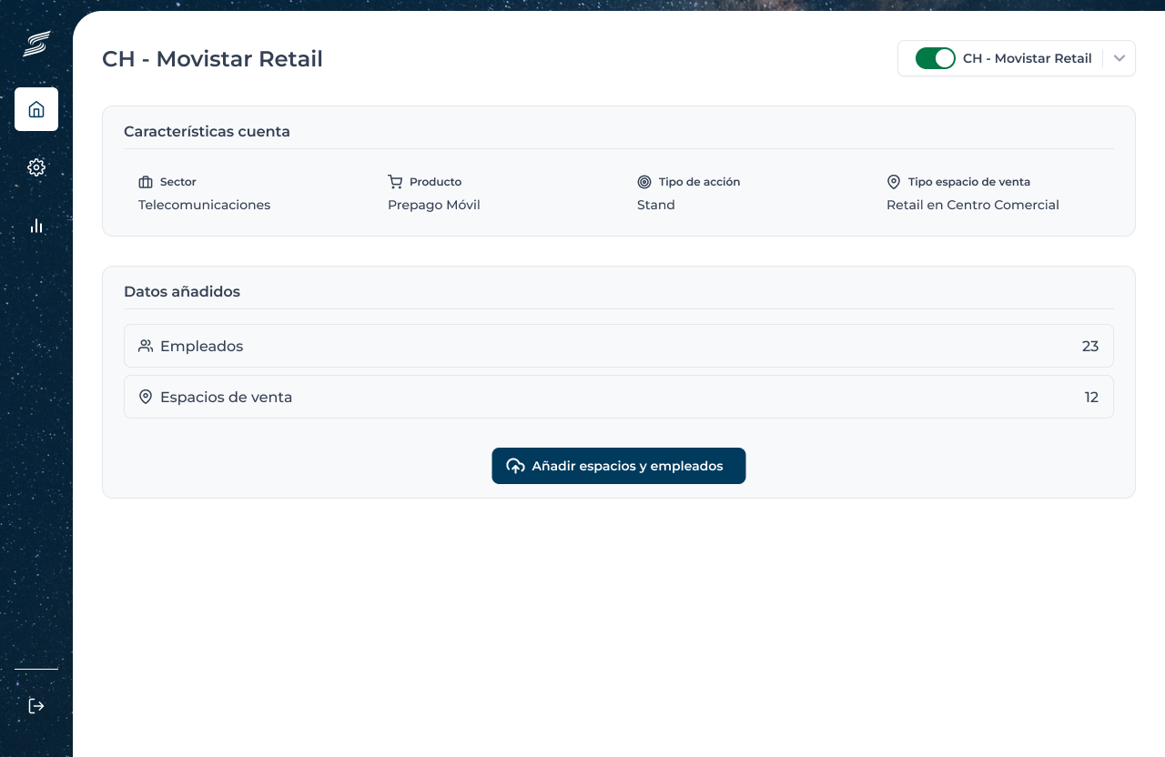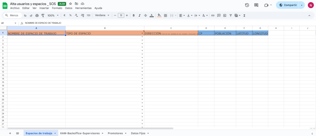 Negocio junto con el equipo de desarrollo se concluyó que la creación de datos relativos a una cuenta (espacios de trabajo, empelados y relaciones) se haría mediante la subida de un Excel. Tras consensuar los datos para cada uno de los entes, validamos el Excel poniéndolo en práctica con casos reales.