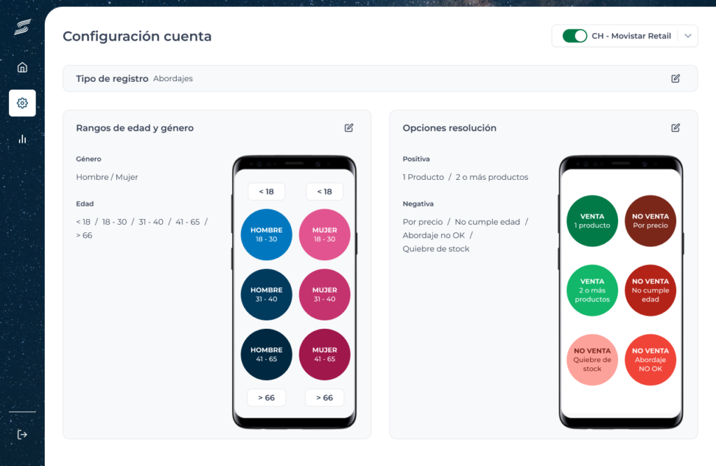 La solución propuesta consiste en una aplicación de escritorio y una aplicación móvil para los promotores. La aplicación de escritorio permite a los usuarios gestionar campañas, puntos de venta, empleados y configuración de los datos a recoger. La app móvil, intuitiva y fácil de usar, permite a los promotores registrar datos sobre cada cliente, como género, edad, y la resolución del abordaje (venta o no venta), todo en solo dos clics. Este proceso simplificado asegura que los promotores no pierdan tiempo y puedan enfocarse en su tarea principal: vender.