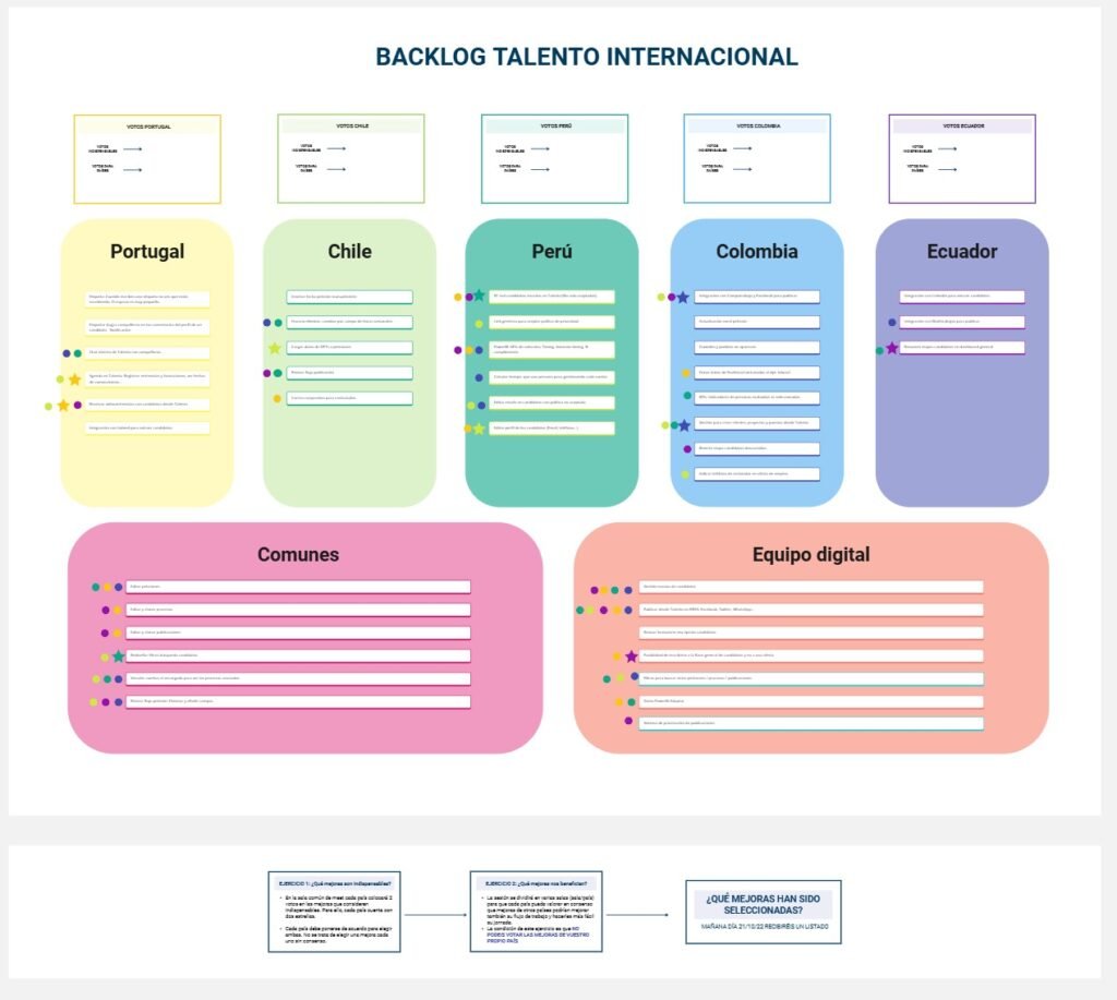 - Focus groups, seleccionando un representante de cada país y departamento clave para cada rol, quienes participaron activamente en las sesiones.