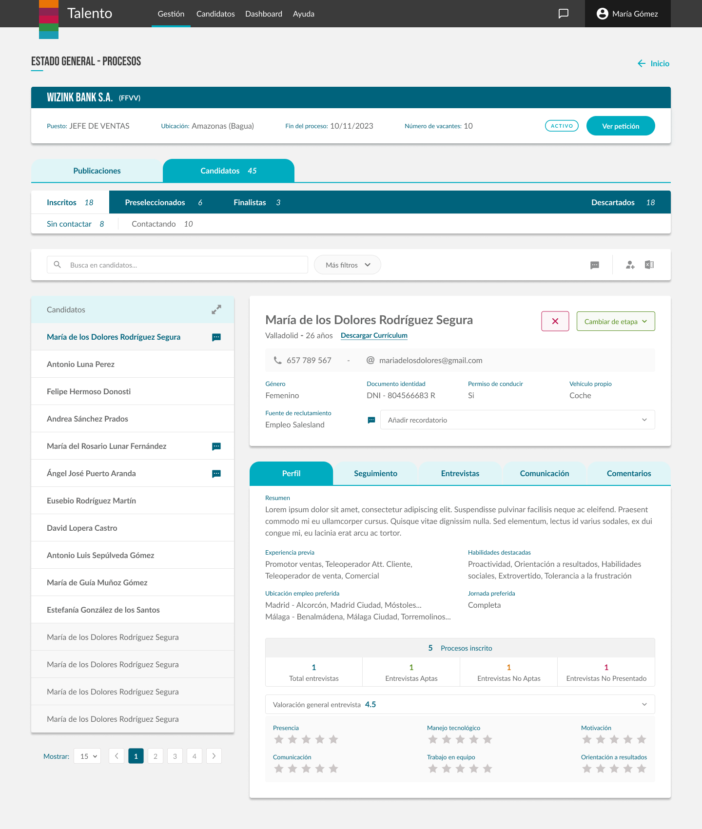 En estas pantallas podemos ver el listado de candidatos dentro de un proceso, así como el perfil completo del candidato.