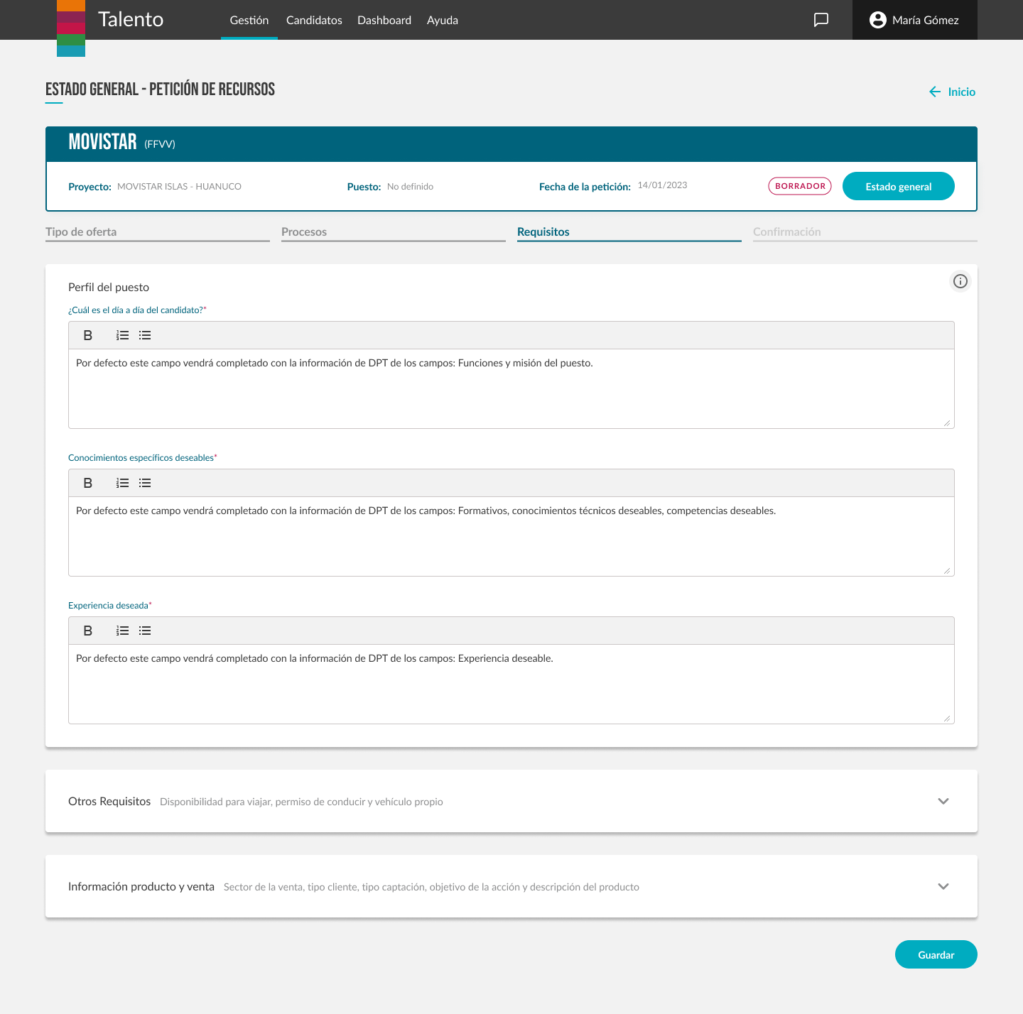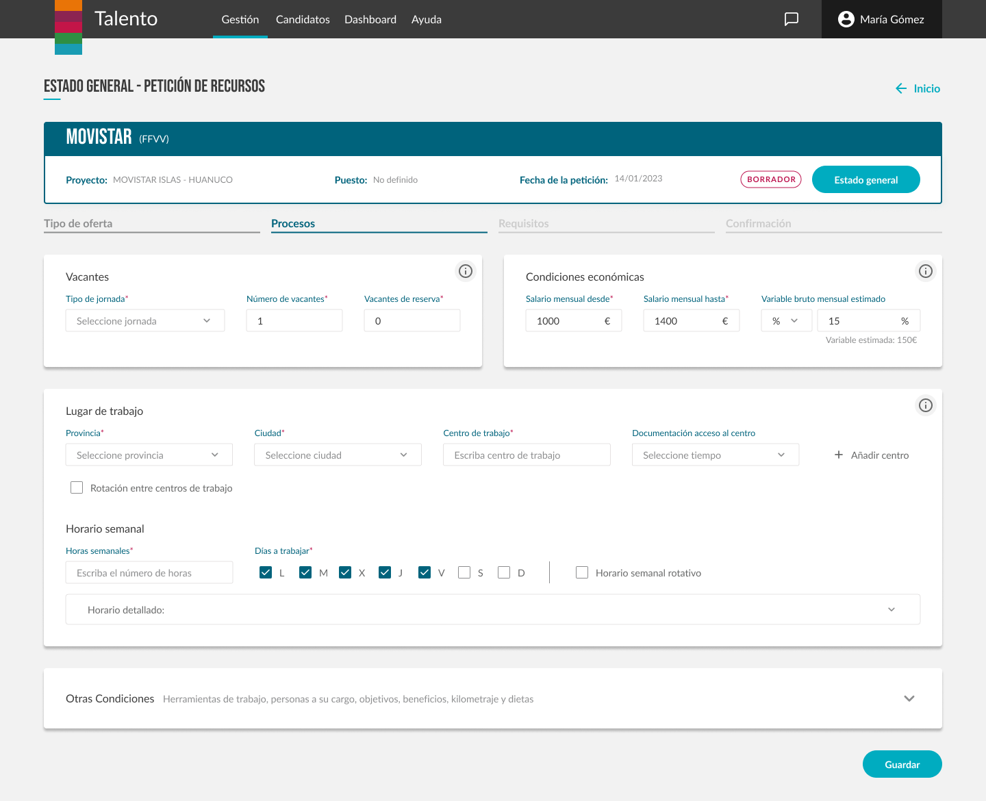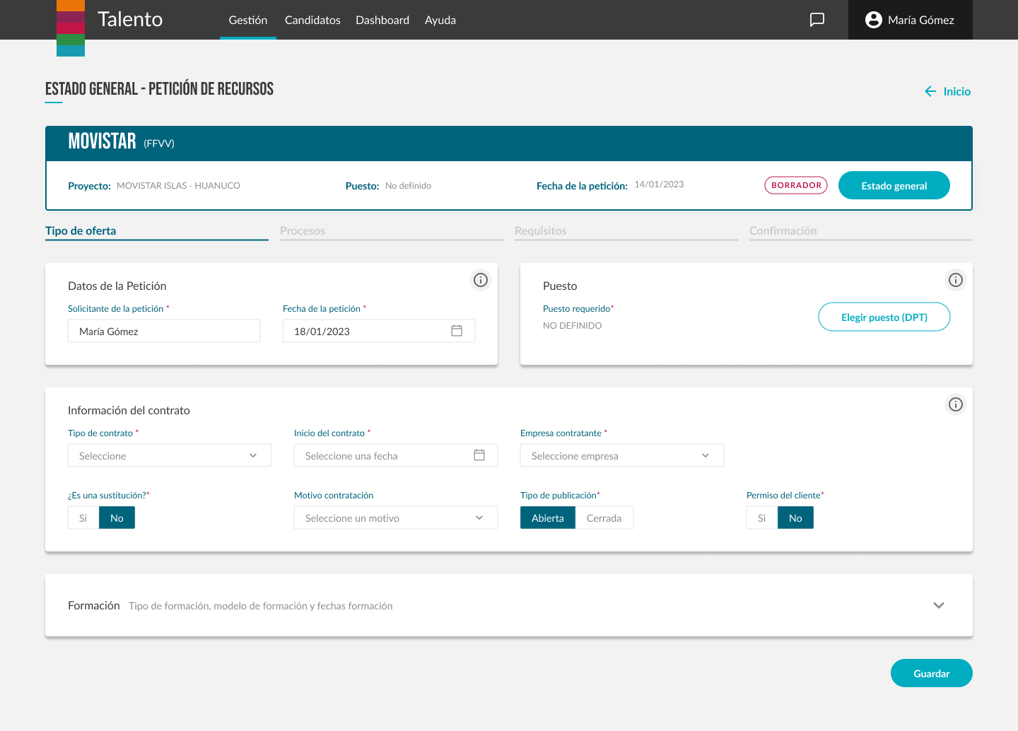 Por ejemplo, la creación de peticiones de necesidad (vacantes), o las etapas del candidato en nuestros procesos, fueron reiteradas varias veces hasta obtener una funcionalidad completamente adecuada y adaptada a todos los equipos.
